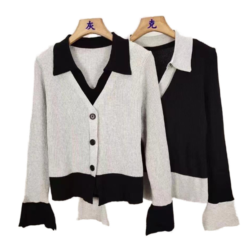 韩版新款毛衣女2024春秋慵懒复古polo领撞色长袖宽松针织开衫外套