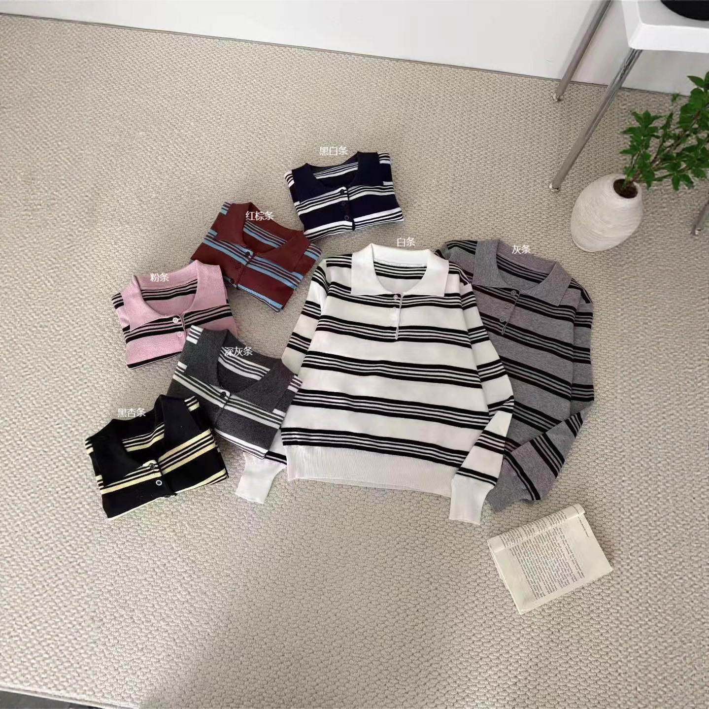 新款2024秋冬娃娃领宽松长袖洋气条纹圆领针织衫毛衣打底撞色上衣