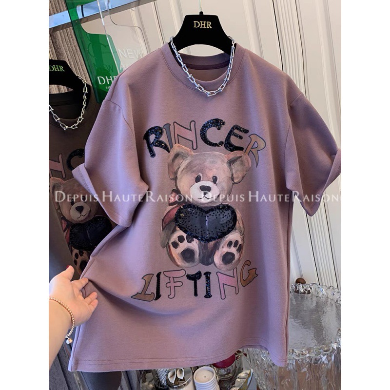 Kaus lengan pendek beruang tebal, Atasan wanita gemuk lengan pendek gaya Eropa musim gugur dan musim dingin 2023