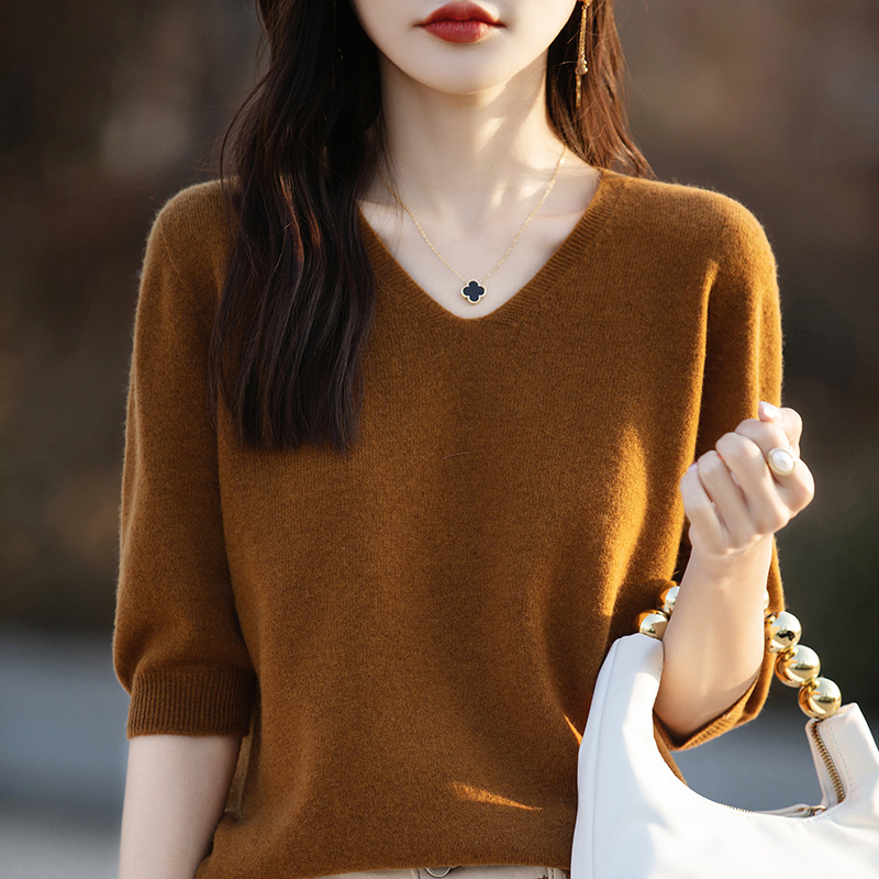 Sweater V-neck wanita lengan pendek, kaus sweater rajutan bawah lengan setengah, warna solid, pullover longgar 24 musim semi baru garis pertama
