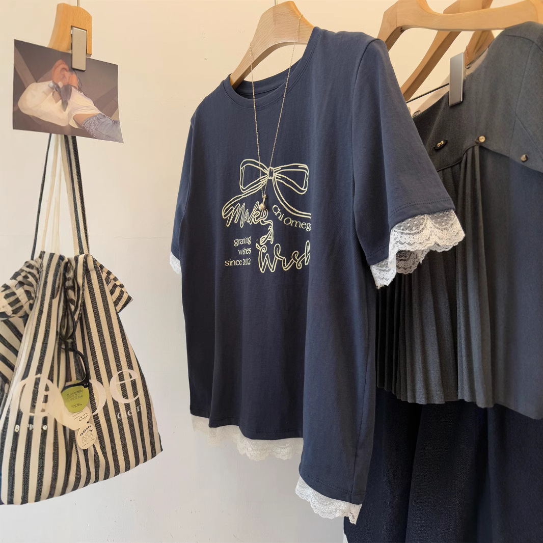 Pakaian Musim Panas 2025 Atasan Menutupi Perut Terlihat Langsing Longgar Kaus Lengan Pendek Renda Ukuran Besar Katun Murni Produk Eropa