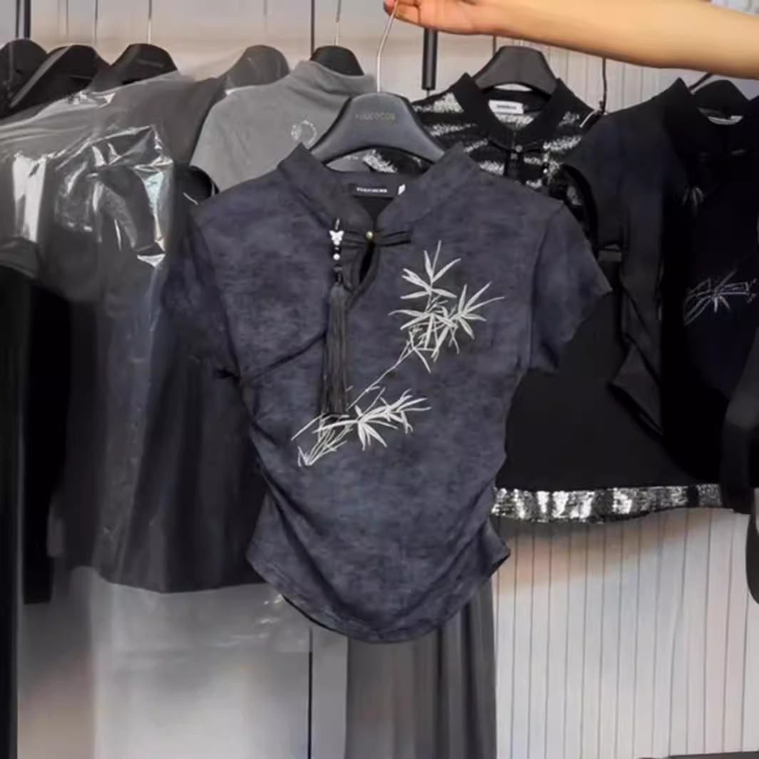 Kaus lengan pendek bordir gaya Tiongkok Baru Musim Panas 2024 Atasan temperamen ceruk rasa desain gadis gemuk baru