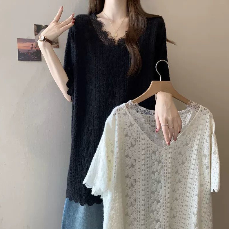 Kaos Kerah V Jahitan Renda Model Korea Wanita Gemuk Musim Panas 300Kg Atasan Lengan Pendek Berongga Menutupi Pinggul Model Panjang Sedang Ukuran Super Besar