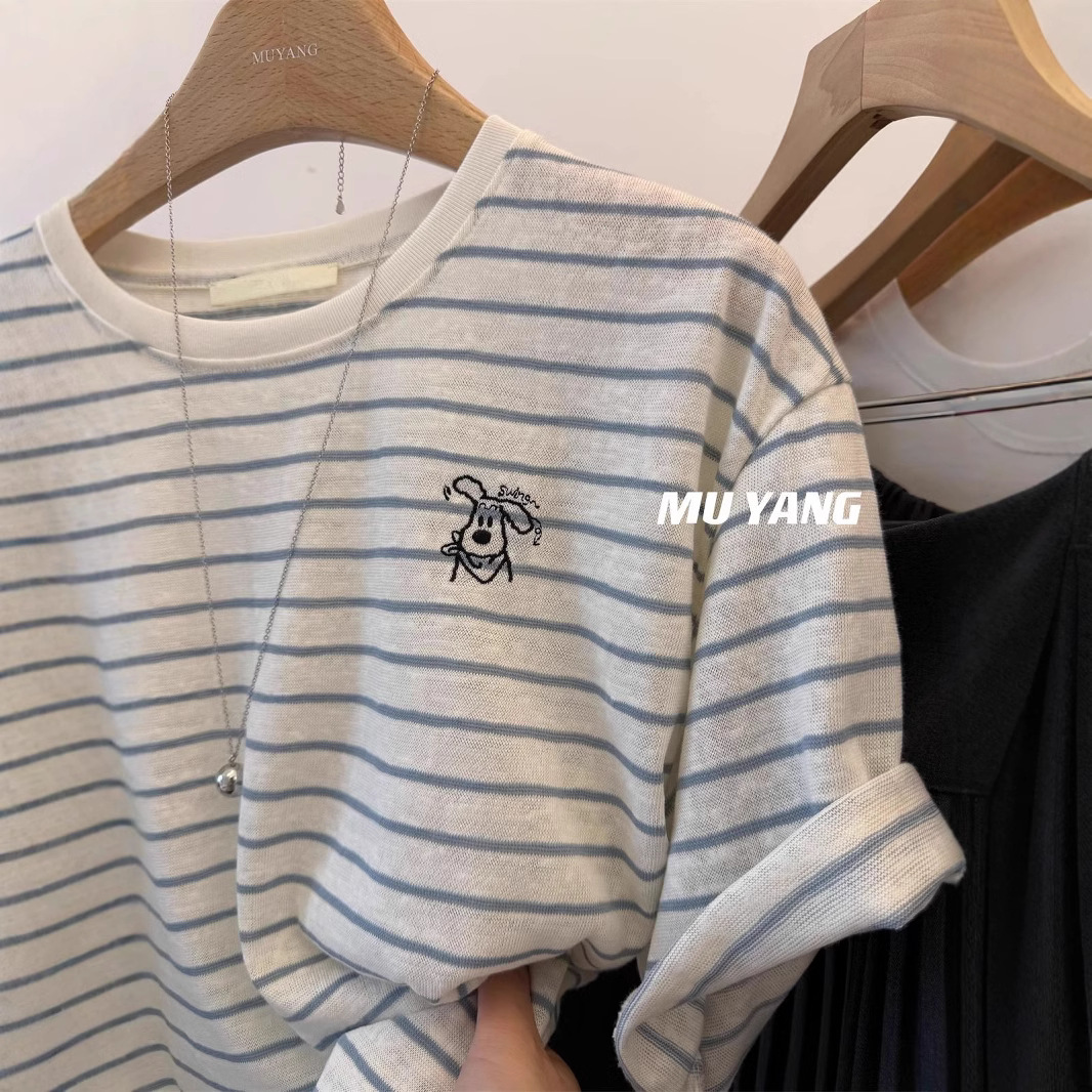 Kaus wanita lengan pendek garis-garis Retro, kaus Dalaman leher bulat desain modis kasual longgar musim panas 2024 untuk pelajar