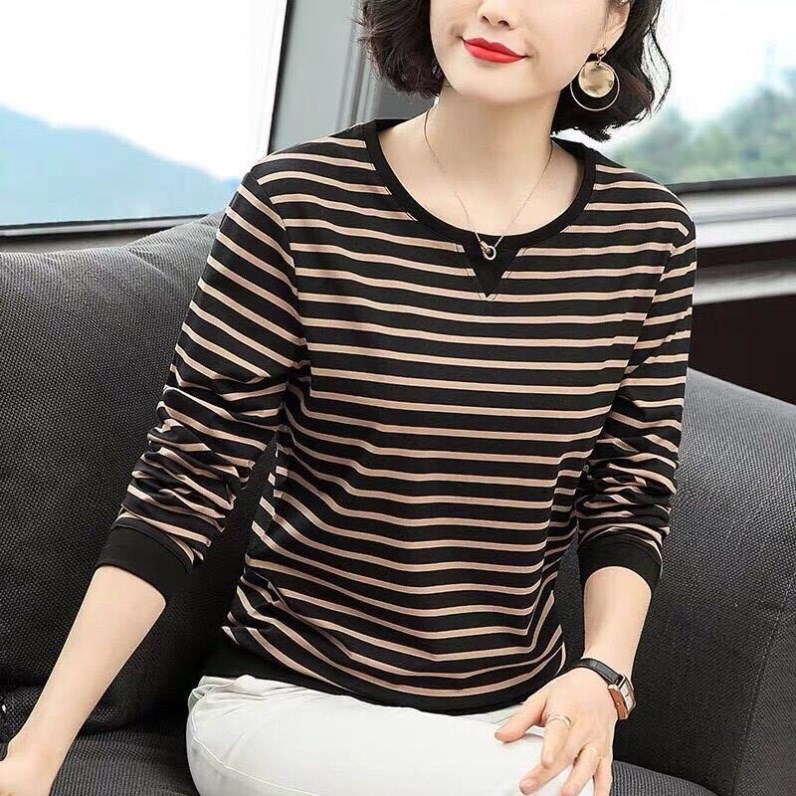 Kaus wanita lengan panjang, Atasan Wanita lengan panjang garis-garis gaya Korea longgar lengan panjang ukuran besar musim gugur dan musim dingin 2022