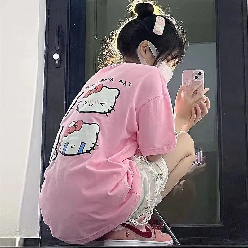 Kaus lengan setengah panjang untuk wanita, tas katun murni kerah belakang motif Hello Kitty, T-shirt longgar manis grosir musim panas model Jepang