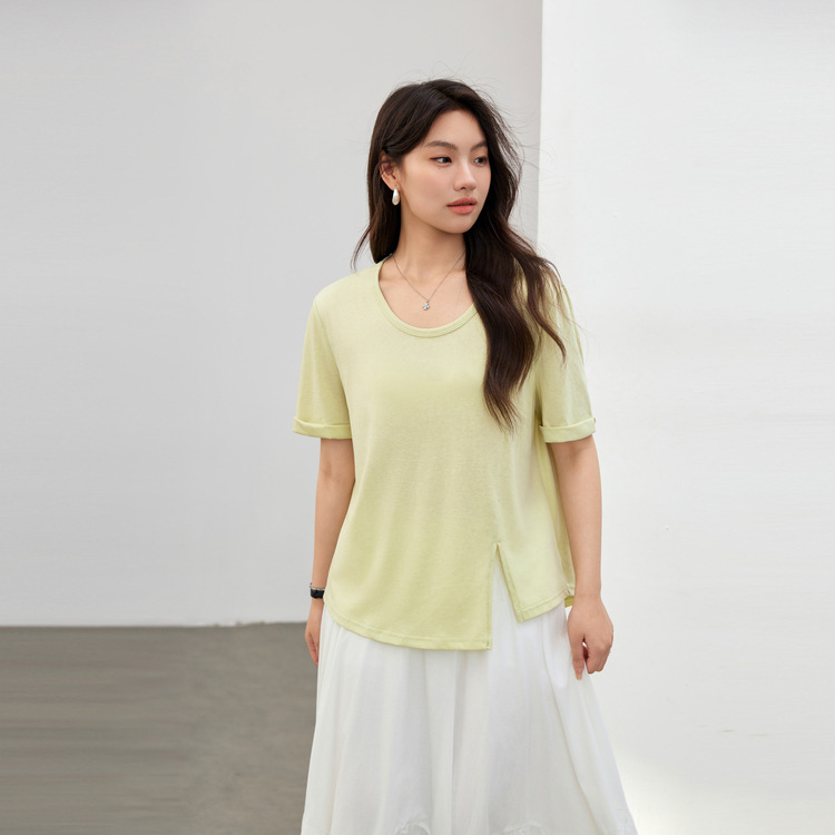 Yuwei 2397 # Real shot wafel super lembut bernapas katun Eropa 2022 musim panas baru lengan pendek leher bulat kaus untuk wanita