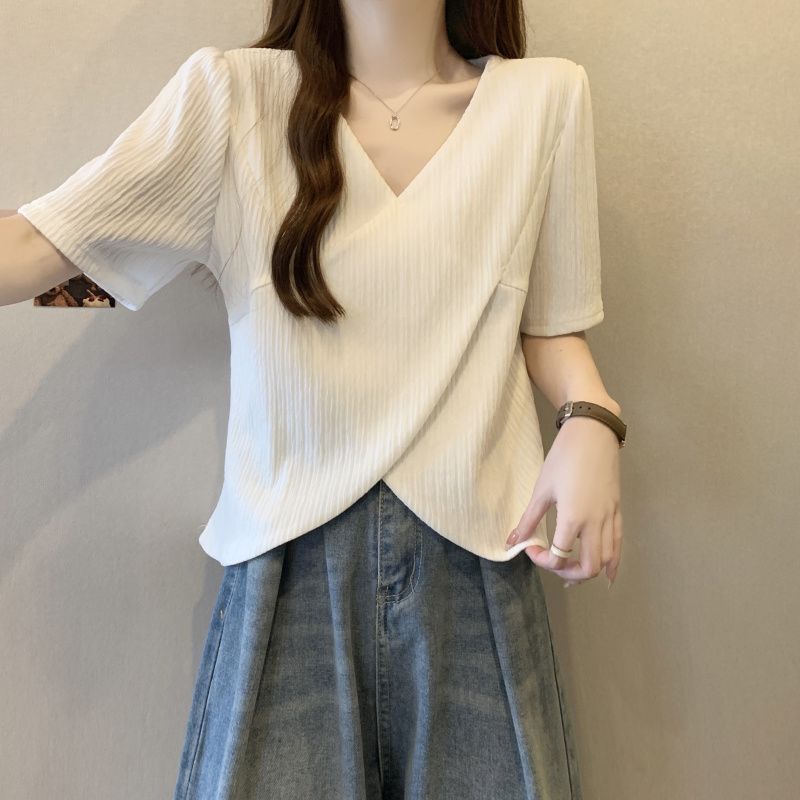 T-Shirt Lengan Pendek Kerah V Tidak Beraturan Ukuran Besar Atasan Chic Silang Gaya Desain Terlihat Langsing Longgar Wanita Gemuk Model Baru Musim Panas