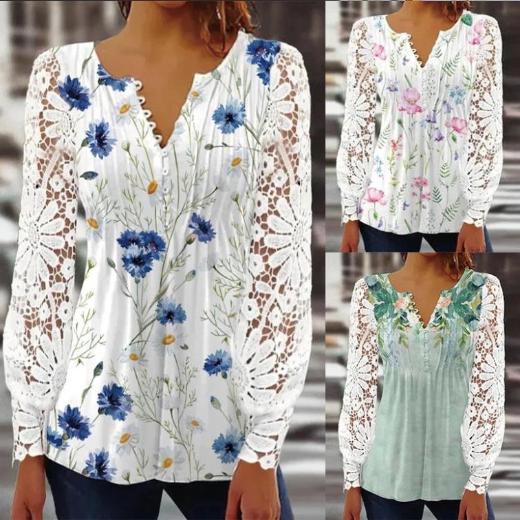 2023 musim semi wanita baru lintas batas Amazon stasiun independen Eropa dan Amerika mode renda lengan panjang musim semi dan musim panas kaus Wanita