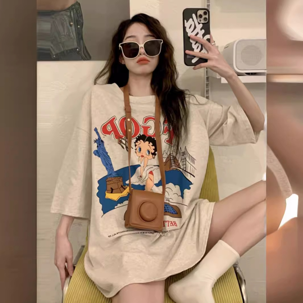 Kaos Oblong Retro Gaya Amerika Atasan Trendi Desain Niche Instagram Terlihat Langsing Longgar Lengan Pendek Katun Murni Ukuran Besar Wanita