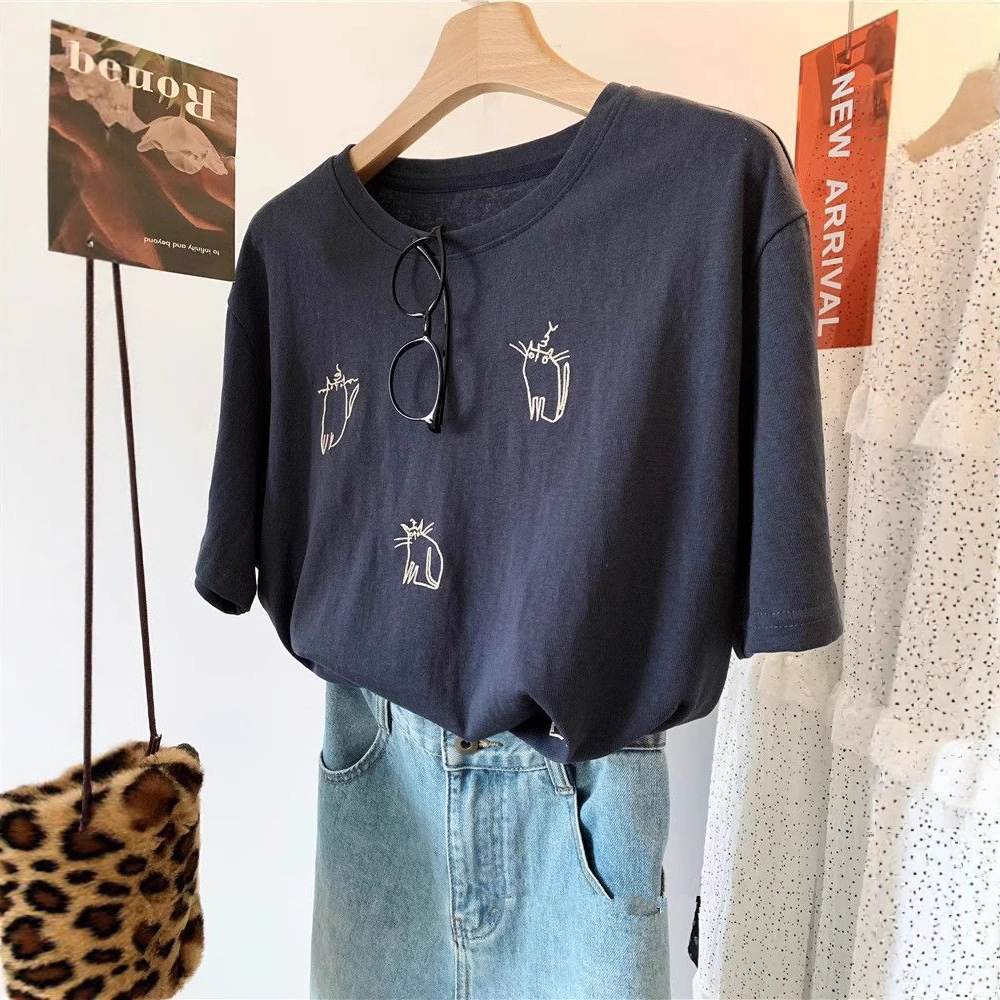 T-Shirt Lengan Pendek Mudah Dipadu Padan Kasual Retro Wanita Longgar Model Baru Musim Panas Kapas Snowy Kucing Bordir Ukuran Super Besar 240Kg