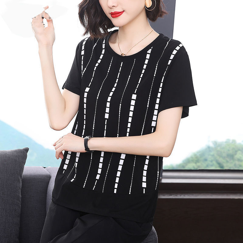 Atasan Wanita tipis ibu, kaus lengan pendek leher bulat, Busana Wanita tipis musim panas 2023, atasan pelangsing longgar gaya Barat, ukuran plus