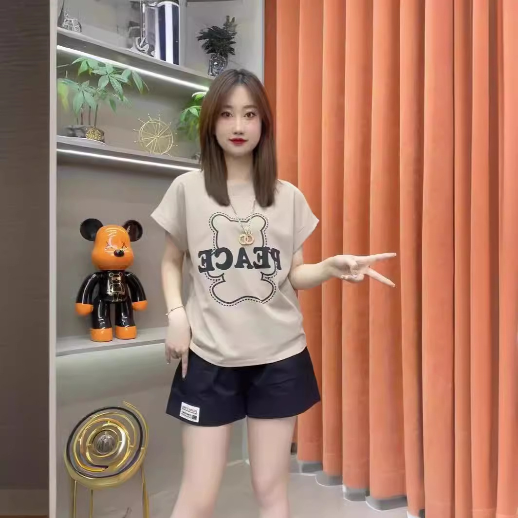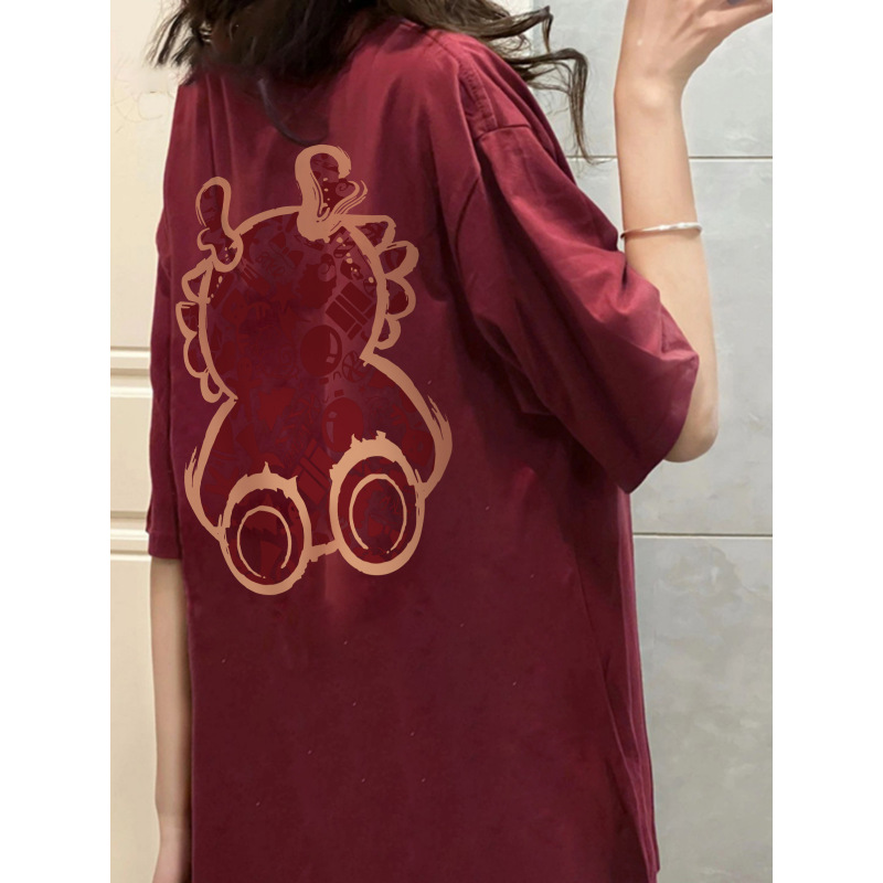 Kaus lengan pendek wanita musim panas 100% katun baru 2024 mode atasan cetak huruf kartun beruang longgar mode