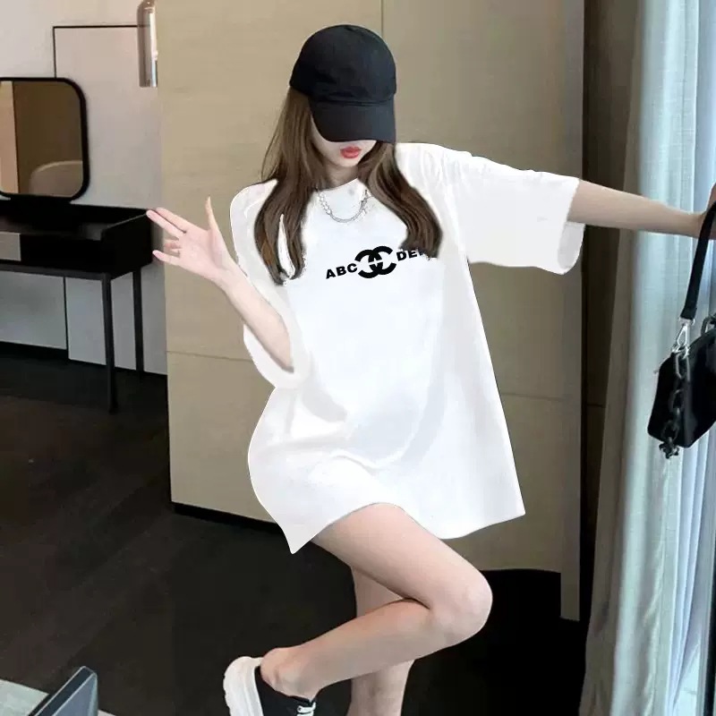 Kaus lengan pendek longgar untuk wanita, T-shirt motif huruf longgar putih panjang sedang versi besar modis 2023