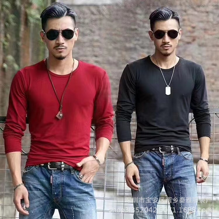 男士长袖T恤纯棉打底衫圆领空白纯色薄款上衣服黑色体恤修身男装