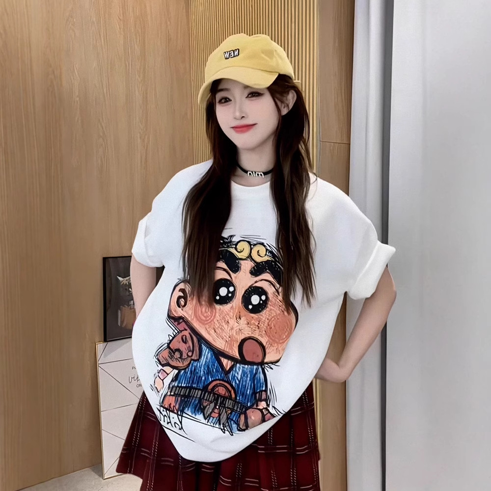Crayon Xiaoxin kaus lengan pendek besar untuk wanita, pakaian dalam lengan pendek longgar modis musim semi dan panas 2024