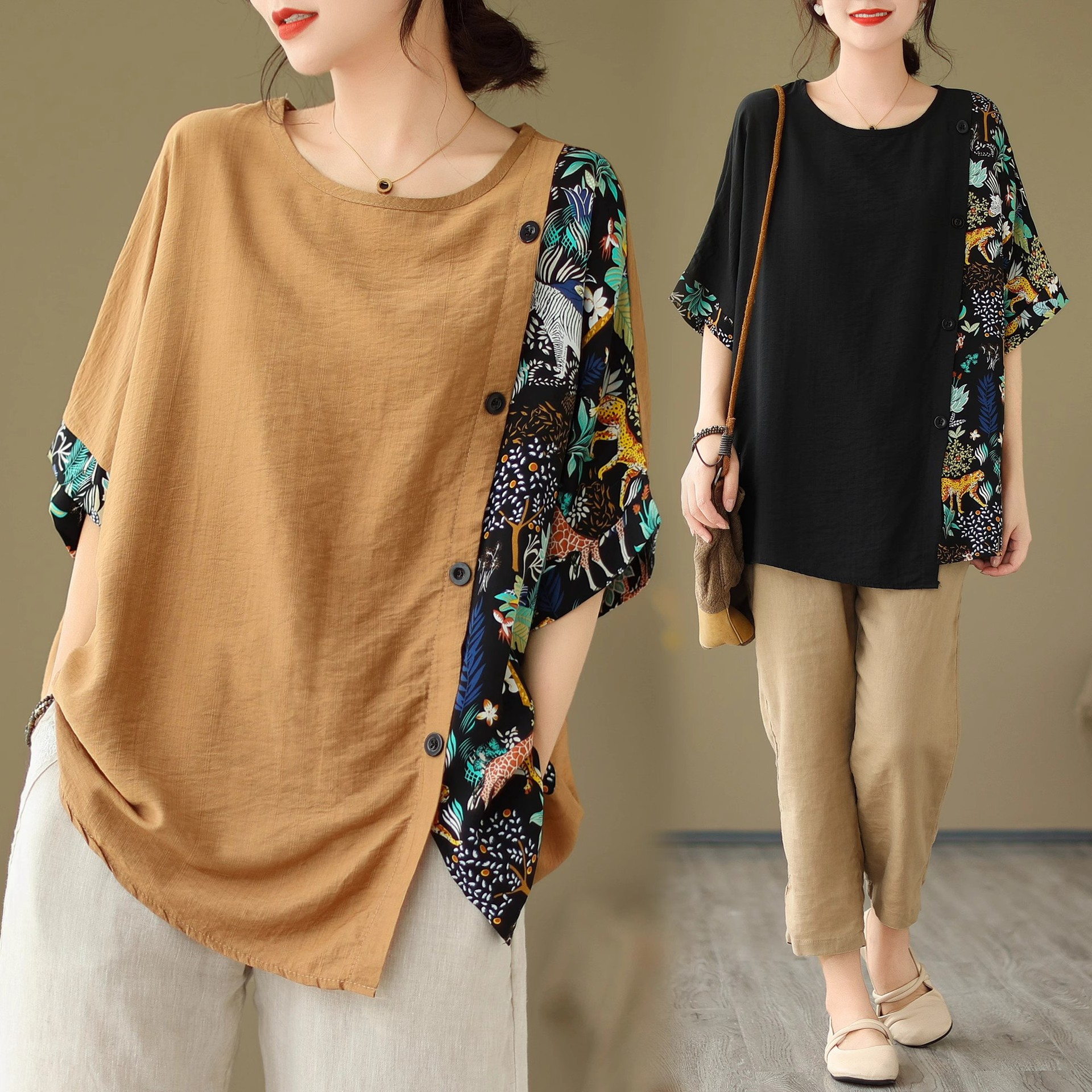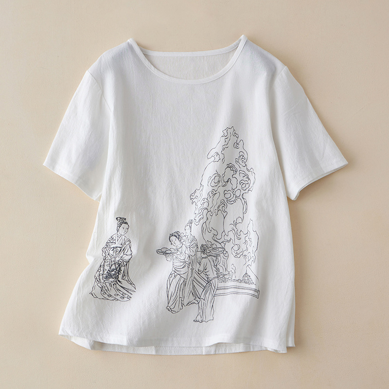 Atasan Katun Retro Musim Panas Longgar Lengan Pendek Model Baru Ukuran Besar T-Shirt Wanita Kerah Bulat Artistik Kasual Gaya Tiongkok 2025