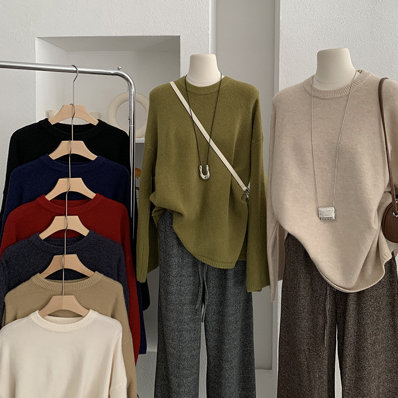 欧玛莱 圆领纯色宽松长袖针织衫2025年秋季百搭韩系休闲毛衣 4272
