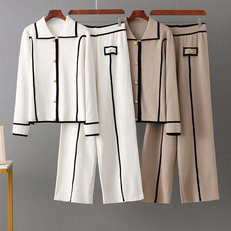 Perdagangan Luar Negeri Eropa Amerika Serikat Grosir Set Rajut Musim Gugur Musim Dingin Gesper Tunggal Polo Kerah Sweater Kasual Olahraga Celana Kaki Lebar Dua Set