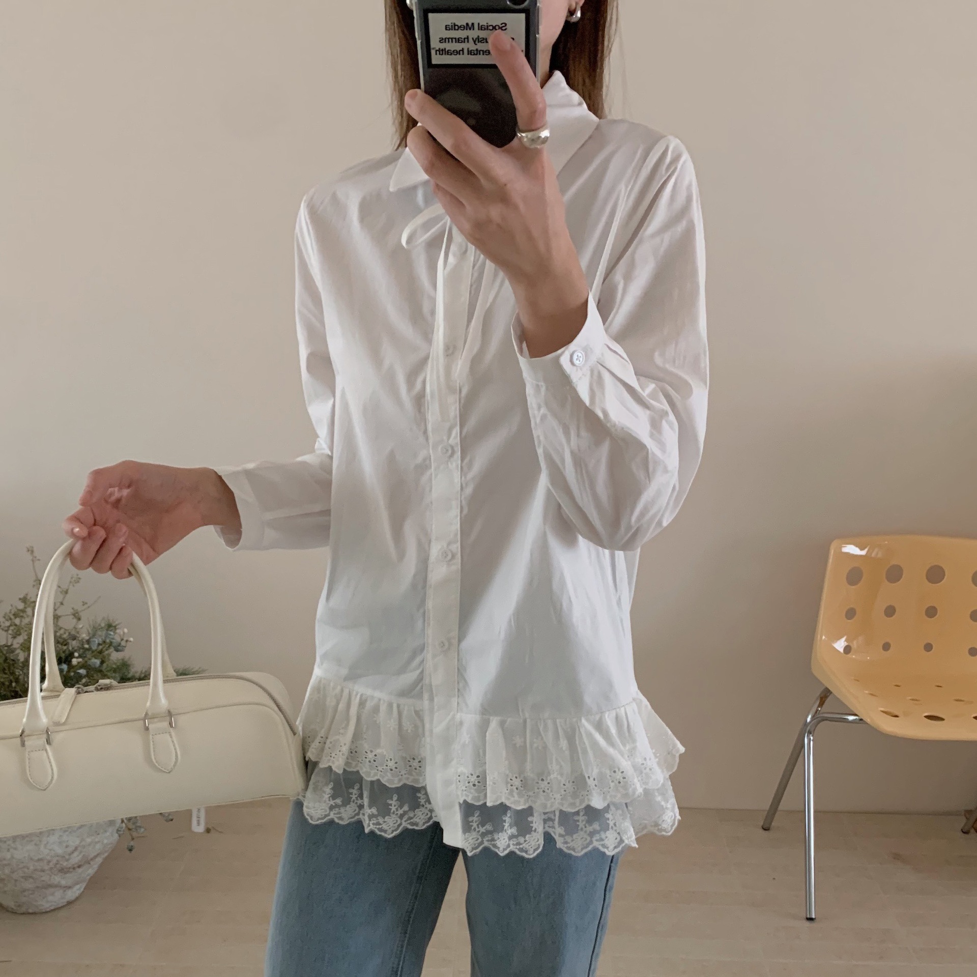 白色polo领衬衫女早秋设计感拼接蕾丝下摆长袖宽松甜美学院风衬衣