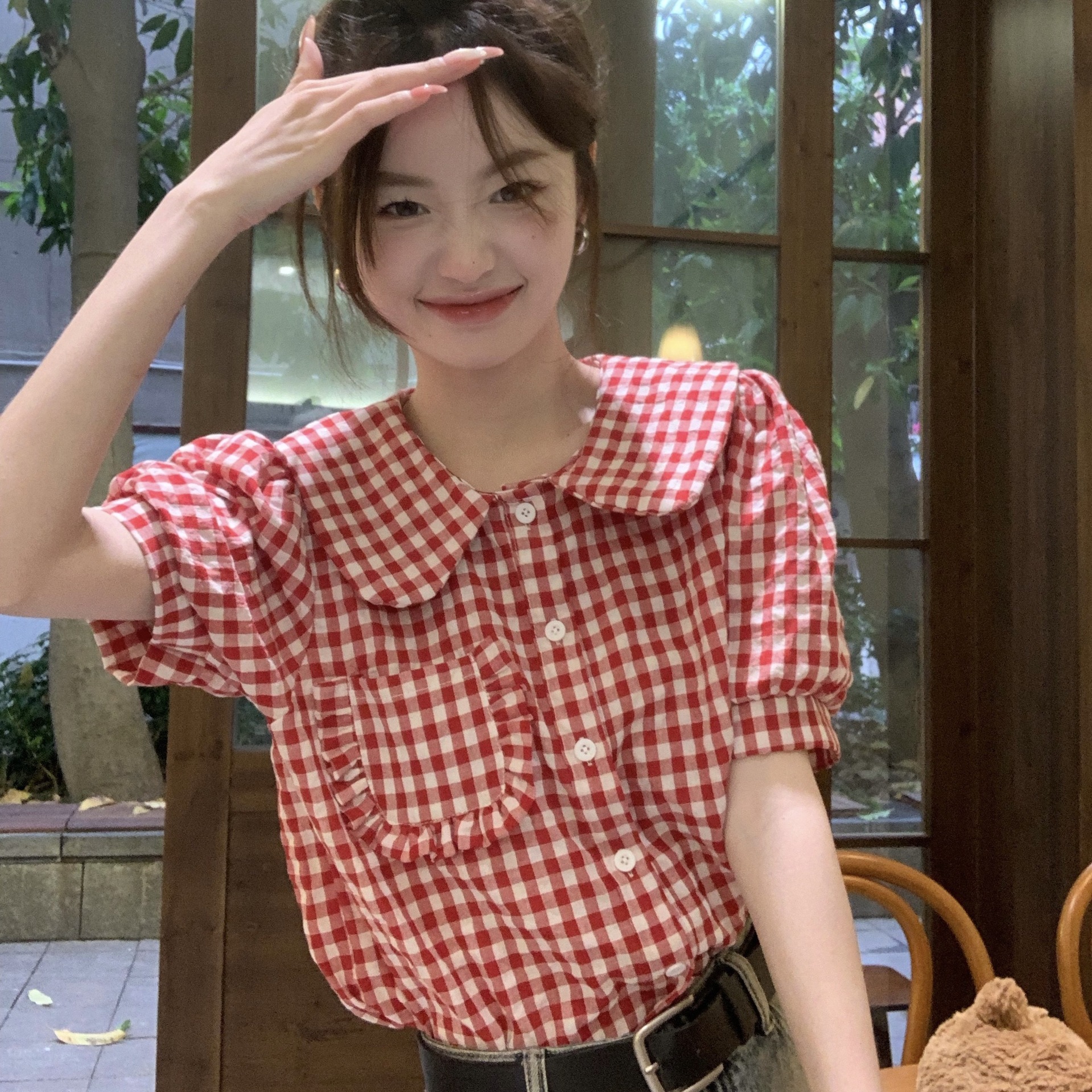 红色格子衬衫女春夏新款小清新甜美娃娃领上衣设计感小众短袖上衣