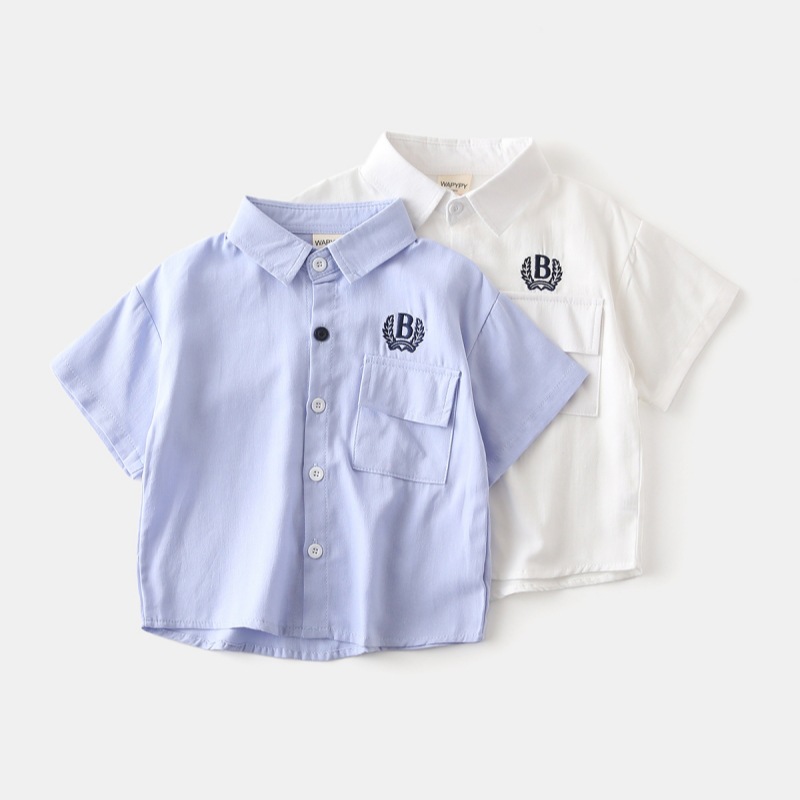 Pakaian Anak-anak Model Musim Panas 2025 Produk Baru Kemeja Lengan Pendek Anak Laki-laki Grosir Kemeja Bordir Huruf Longgar Bayi Satu Potong