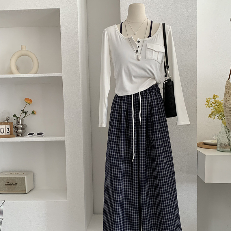 欧玛莱 假两件挂脖吊拼色长袖T恤+格子阔腿裤休闲两件套秋款 4409