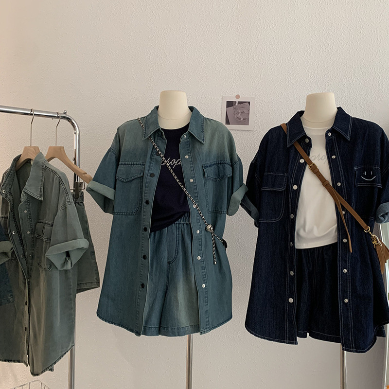 Omaray Kerah Tersenyum Saku Bordir Lengan Pendek Kemeja Denim Jaket Kaki Lebar Celana Pendek Dua Set 3812 Wanita