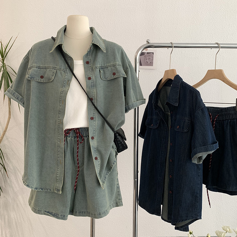 Omaray Kemeja Denim Model Setengah Panjang Lengan Pendek Kerah Jungkid Atasan Celana Pendek Lebar Pinggang Tinggi Elat Set Dua Potong 2474