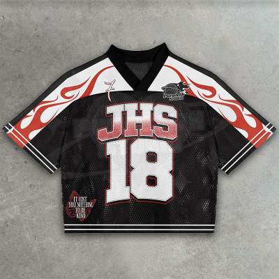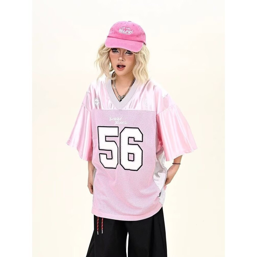 欧若风球衣短袖女宽松休闲运动美式复古T恤网红情侣嘻哈V领赛车服