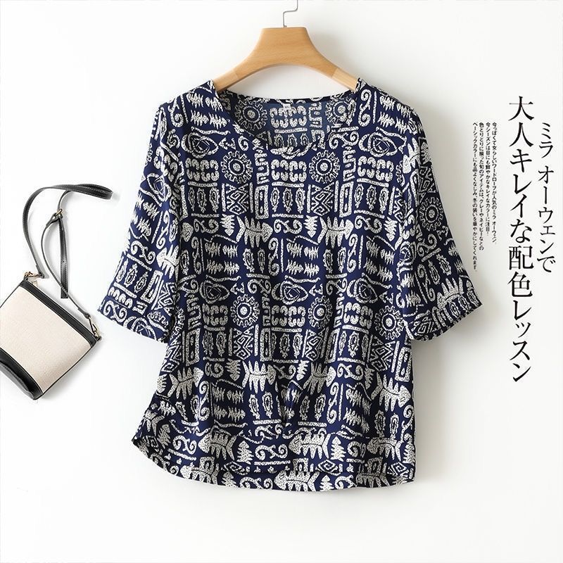 Kaus lengan pendek wanita, atasan cetak geometris longgar ukuran plus, kaus ibu usia sedang lengan pendek baru musim panas 2022