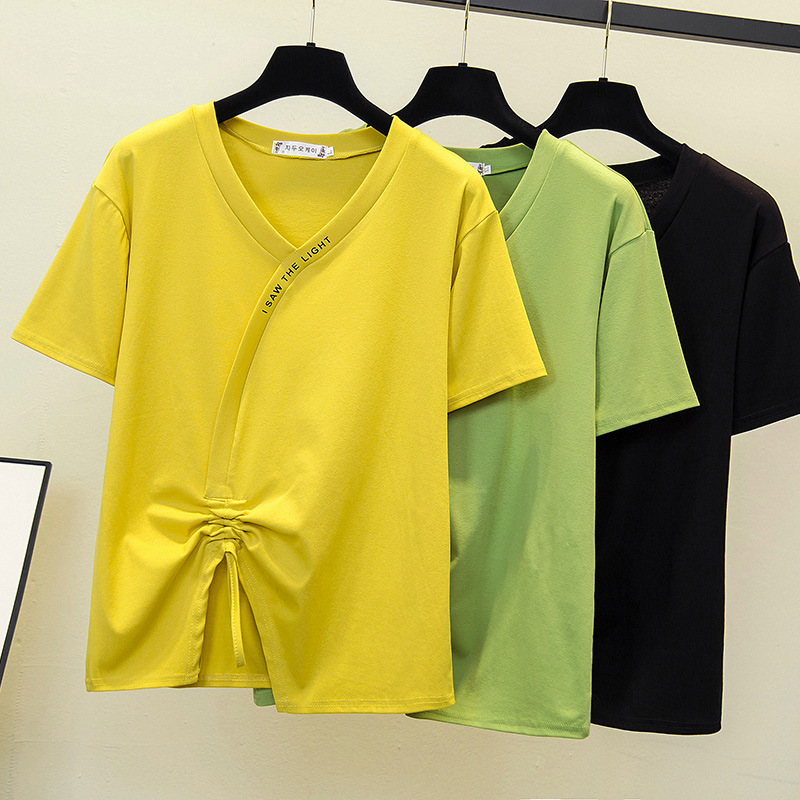Pakaian Musim Semi dan Musim Panas Atasan Pendek Wanita Model Baru Lengan Pendek Desain Khusus Niche Ibu Elegan Wanita Gemuk Ukuran Besar Wanita Gemuk T-shirt Lipit