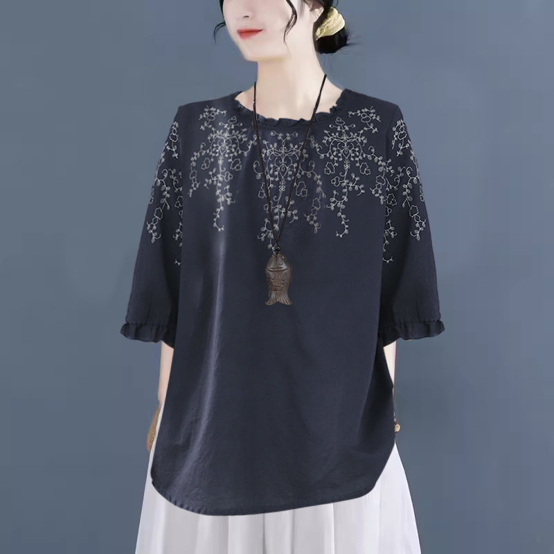 复古文艺碎花边夏季新短袖T恤印花上衣洋气女士妈妈民族风宽松潮