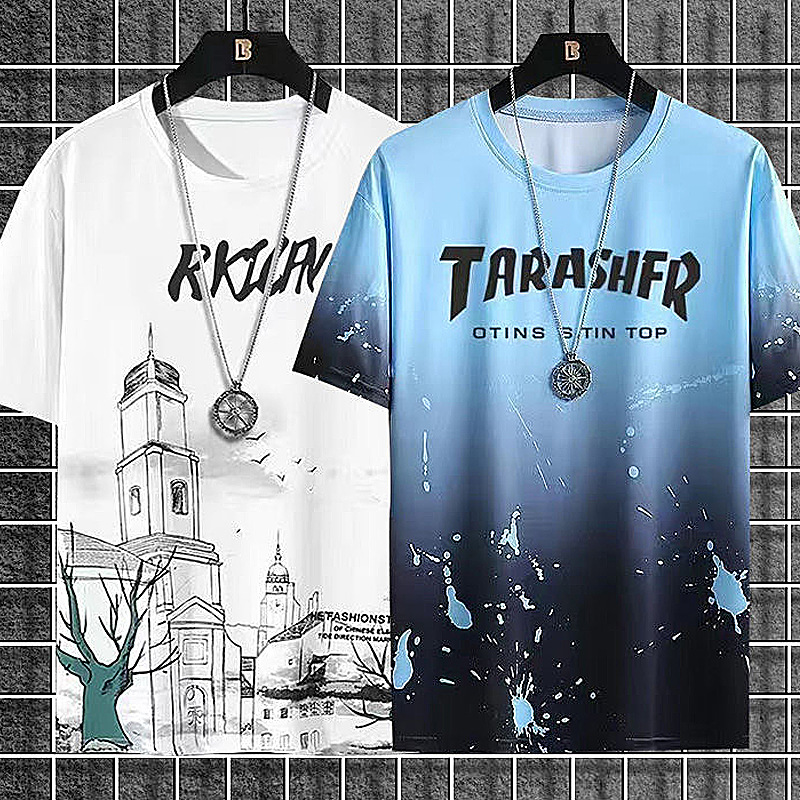 Kaos oblong pria lengan pendek musim panas 2025, gradasi warna, cepat kering, bahan sutra es, ukuran besar, longgar, kasual, keren.