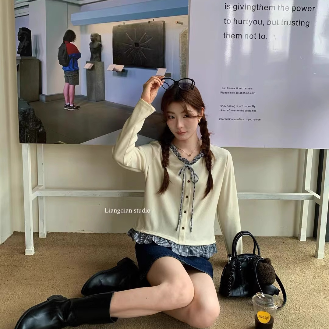 罗纹德绒格子拼接木耳边长袖T恤女秋季2025新款大码假两件上衣