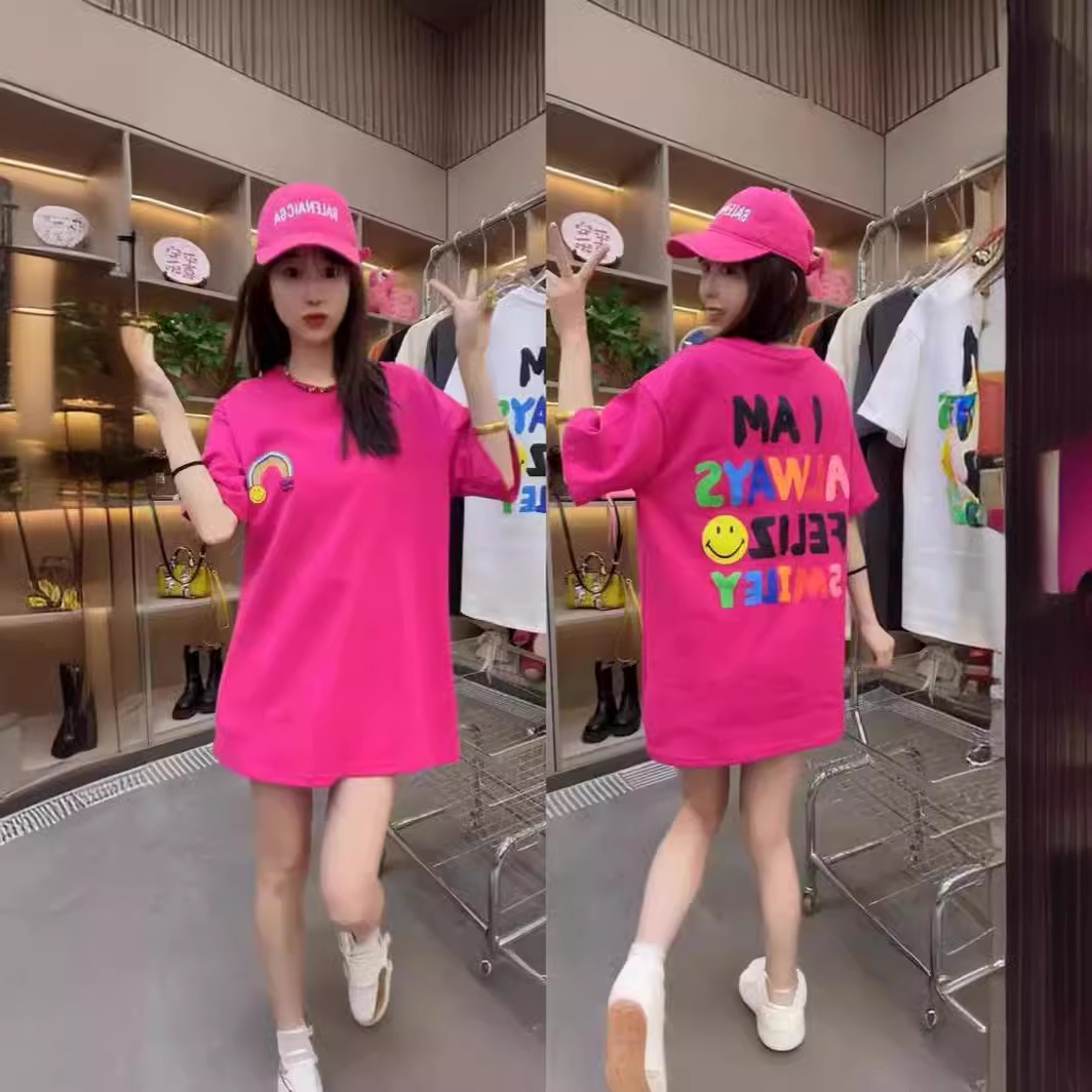 Kaus lengan pendek huruf warna-warni untuk wanita, atasan lengan setengah pelajar ukuran plus longgar baru gaya Korea Musim Panas 2024
