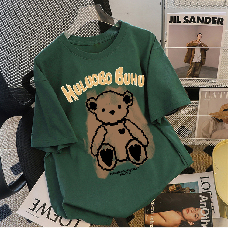 Bear T-shirt katun lengan pendek wanita, kemeja katun retro Amerika longgar lengan setengah Musim Panas 2024