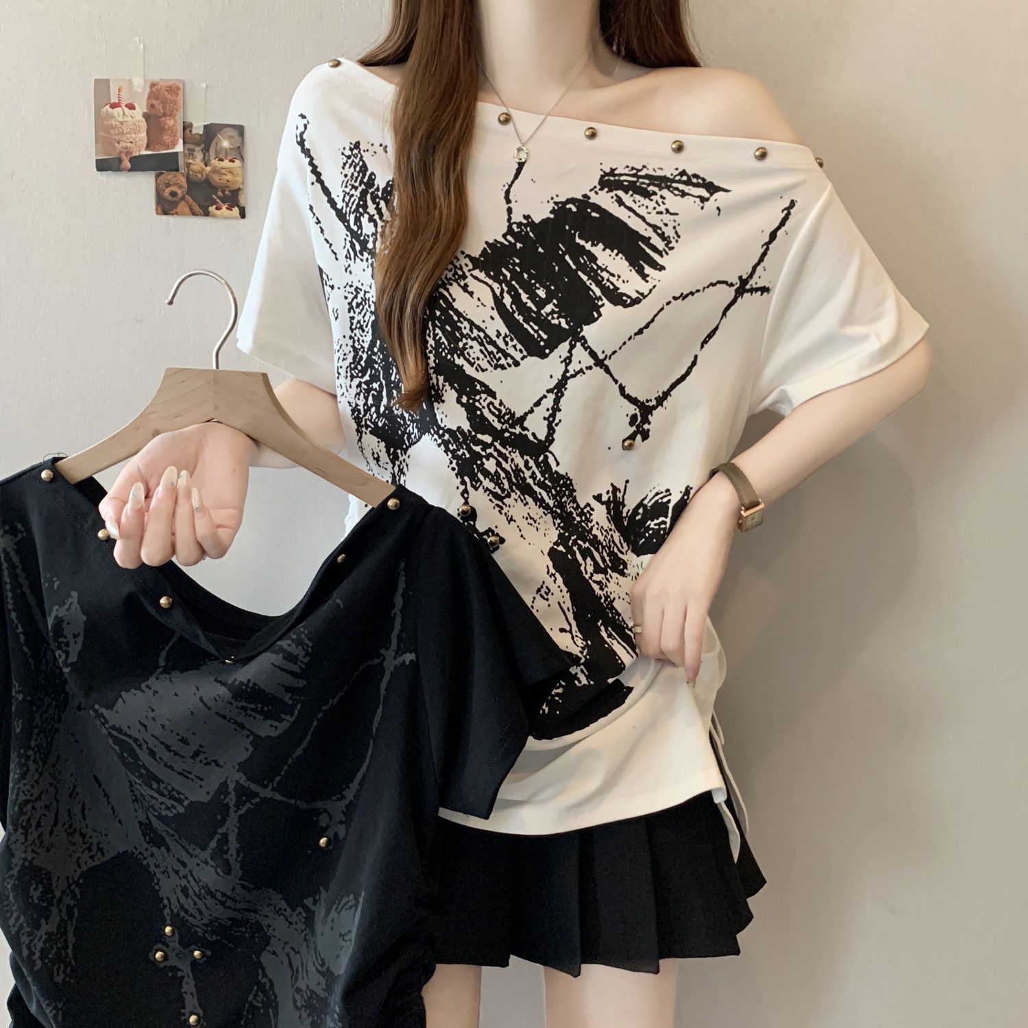 大码复古印花露肩短袖t恤女2025夏季新款韩版宽松显瘦时尚上衣女
