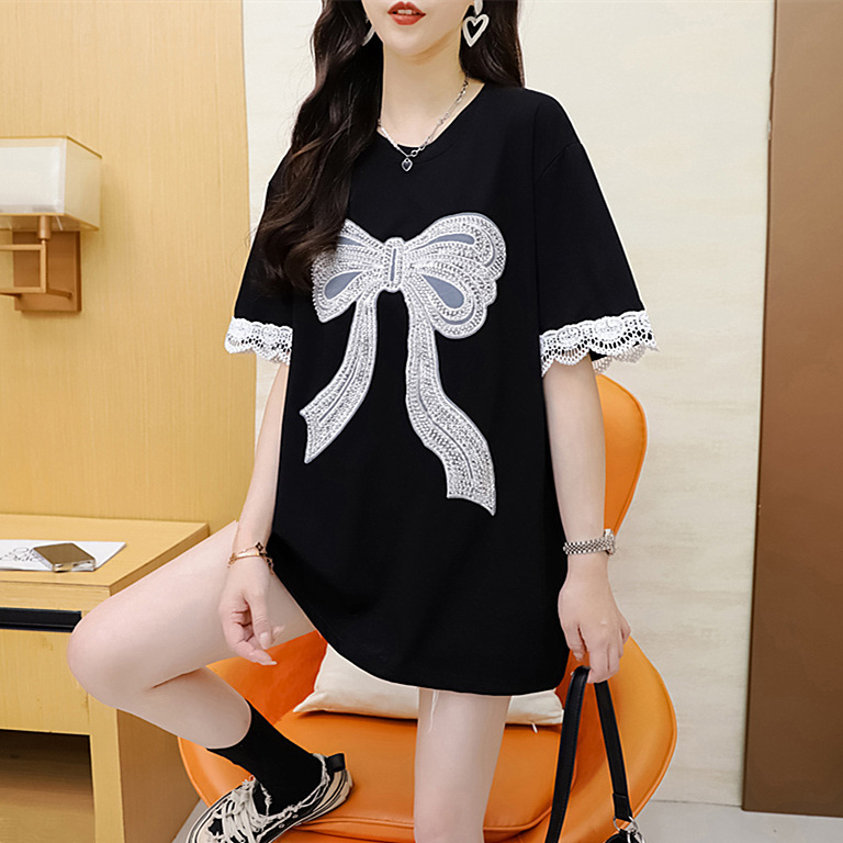 220克纯棉重工刺绣钉珠蝴蝶结短袖T恤女夏季宽松大版潮牌气质上衣