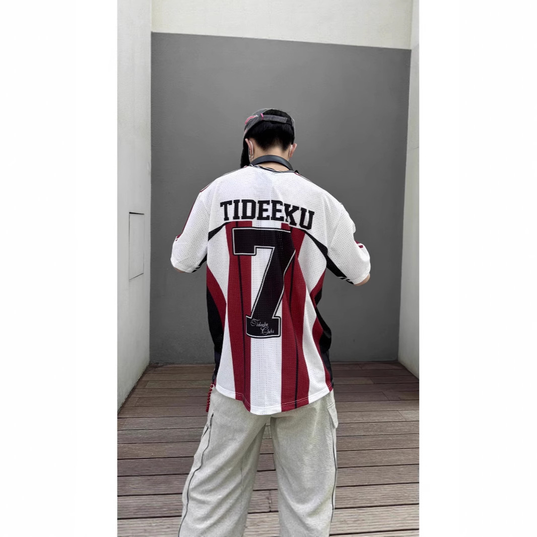 Kaus Lengan Pendek Kerah V Olahraga Retro Gaya Amerika T-shirt Gaya Hip Hop Longgar Pria Wanita Atasan Pasangan Digital Trendi