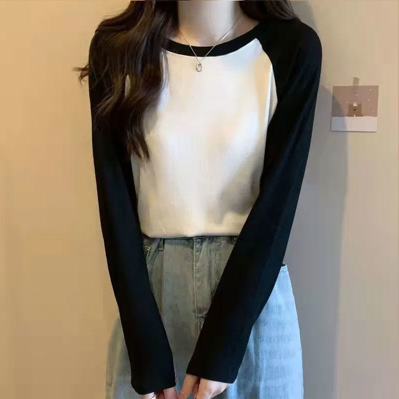 Kaus lengan panjang wanita, atasan lengan panjang reglan wanita ukuran plus, kaus Dalaman sederhana retro gaya Korea musim semi