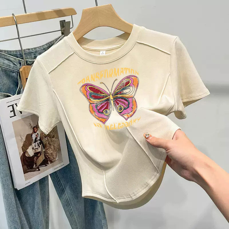 杏色油画印花莫代尔短袖t恤女2024夏季新款韩版宽松简约半袖体恤