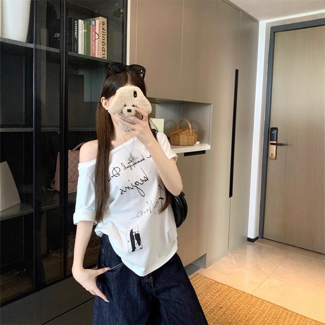 Kaus Lengan Pendek Bahu Terbuka Kerah Miring Bermotif Huruf Atasan Abu-abu Gaya Korea Gaya Desain Longgar Malas Musim Panas Wanita