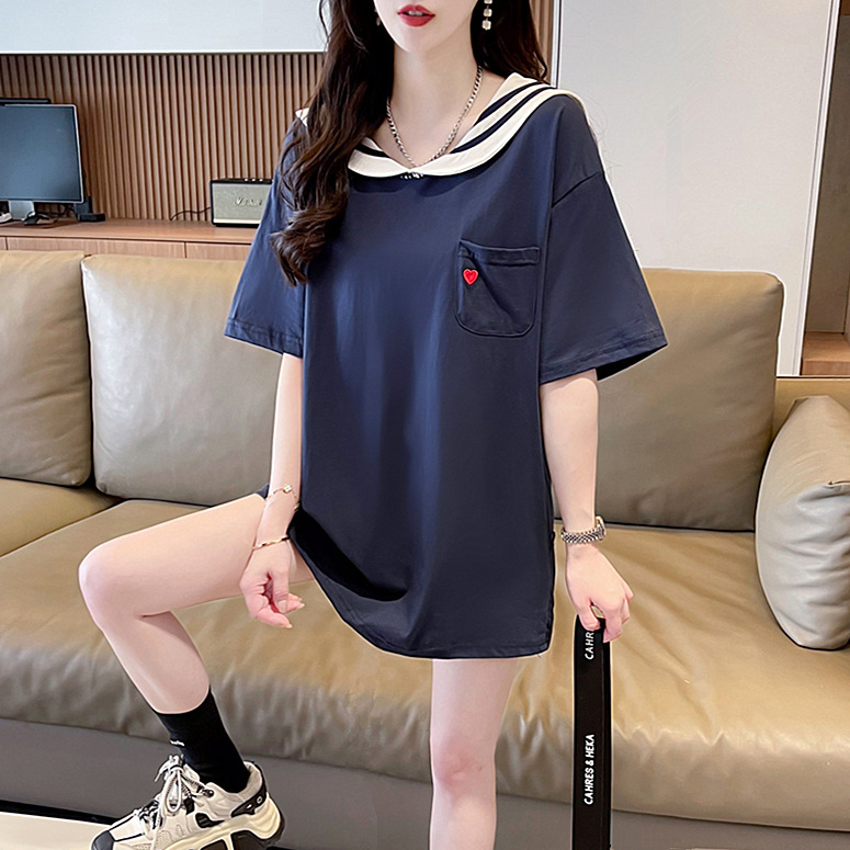 纯棉大码女装海军领刺绣短袖T恤女夏季中长款宽松学院风减龄上衣
