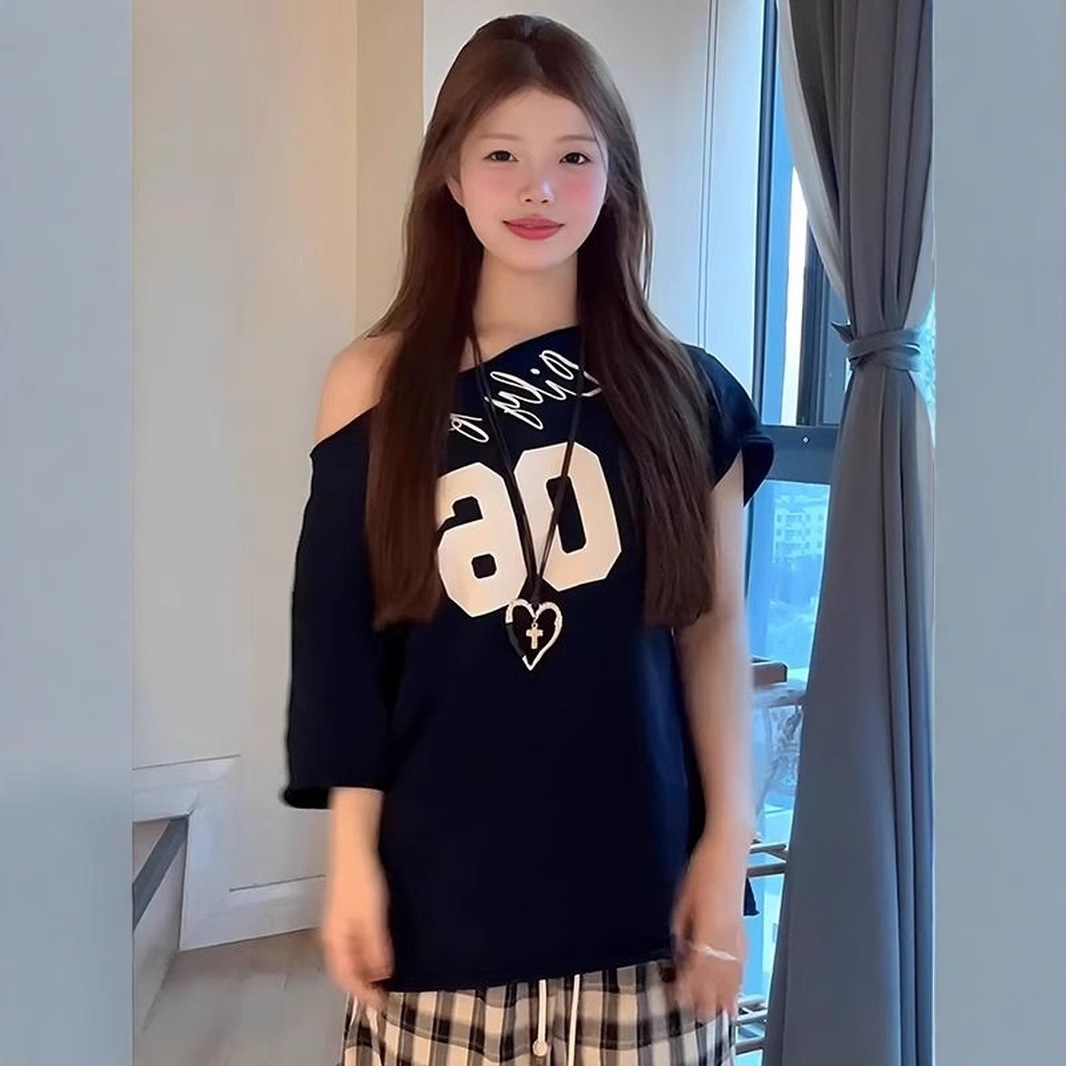 T-Shirt Lengan Pendek Katun Murni Murid Kaus Lengan Setengah Print Bahu Terbuka Bahu Jatuh Wanita Kaus Atasan Lengan Panjang Wanita Musim Panas
