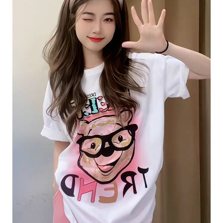 Atasan Wanita Manis Lucu Pakaian Wanita Musim Panas Gemuk M2024 T-shirt Wanita Lengan Pendek Mudah Dipadu Padan Longgar Bercorak Desain Baru