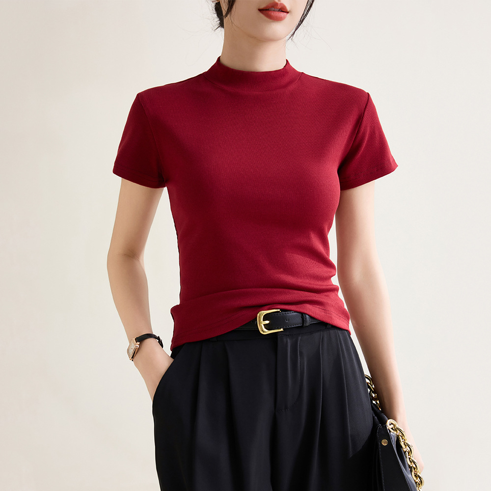 T-Shirt Lengan Pendek Kerah Bulat Bahu Warna Polos Slim Fit Elegan Musim Semi Musim Panas 2024 Atasan Dalaman Tinggi