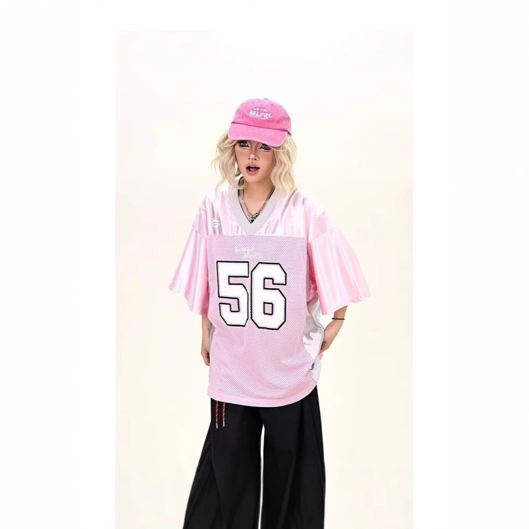 Kaos Pria Bernapas Olahraga Longgar Gaya Amerika Lengan Pendek Ukuran 56 Jala Jahitan Vibe Vibme Retro Hip Hop