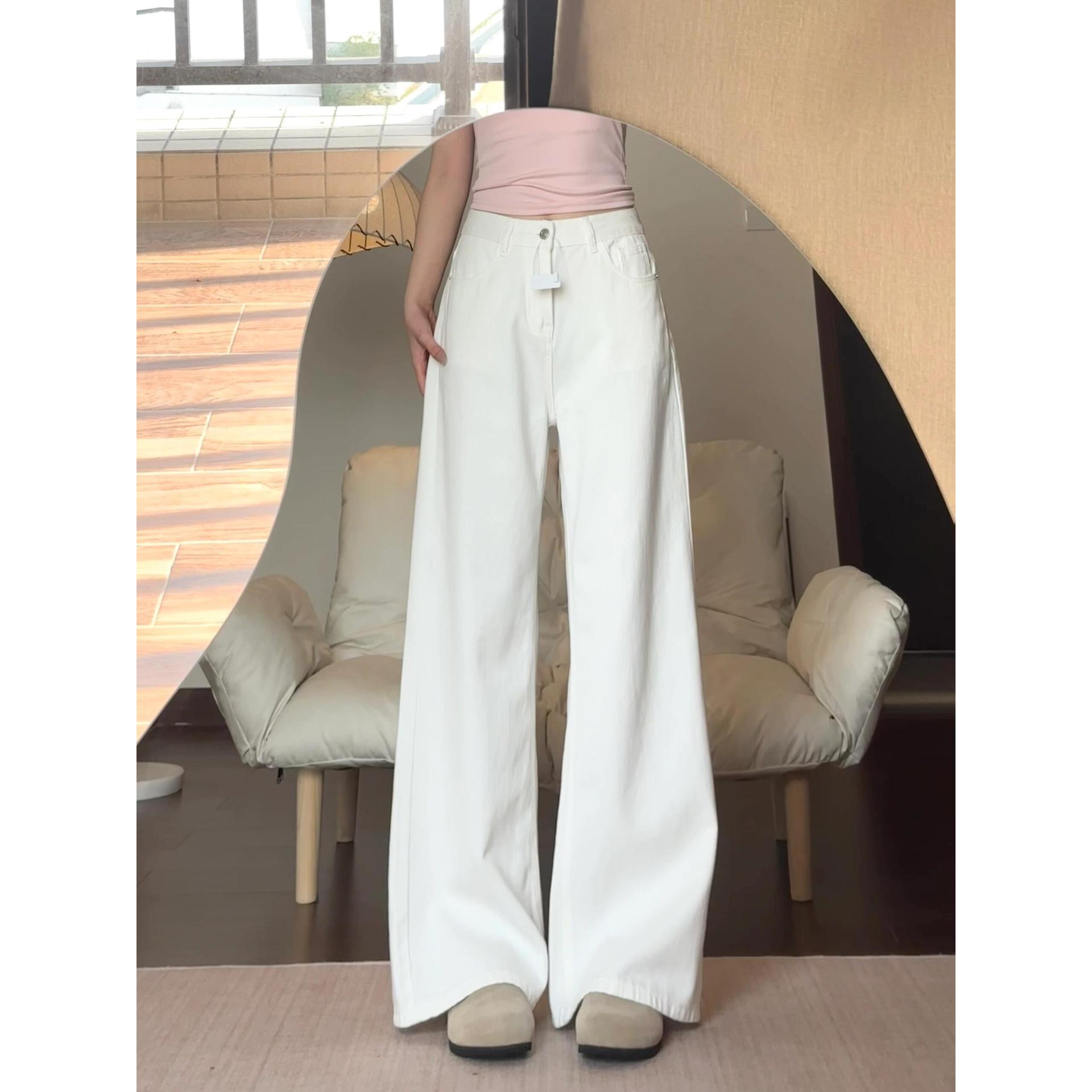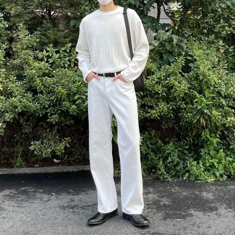 Celana jins panjang gaya Korea, celana jins panjang pria, celana pel kasual retro, celana lurus longgar, celana musim semi putih, gaya Korea