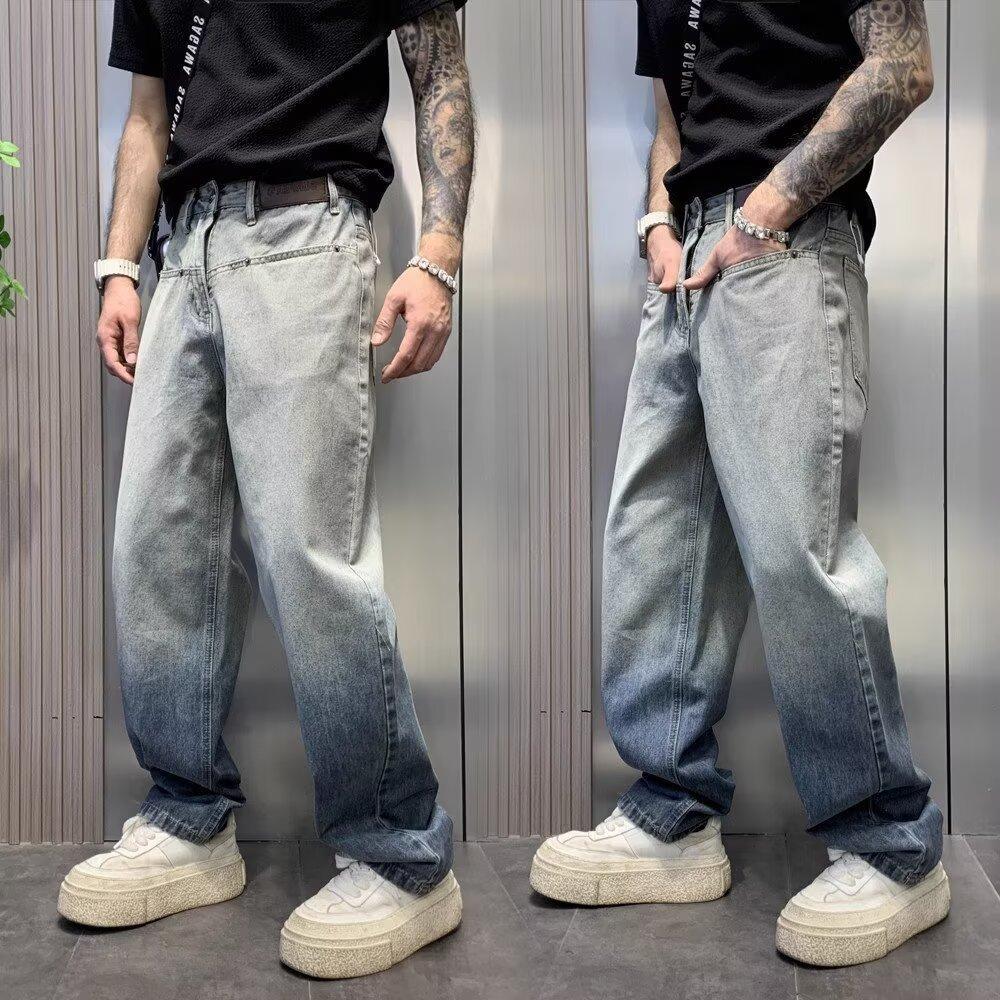 Jins pria retro Amerika warna gradien, jins pria lurus longgar, merek mode baru, pudar, kasual, musim semi, 2024